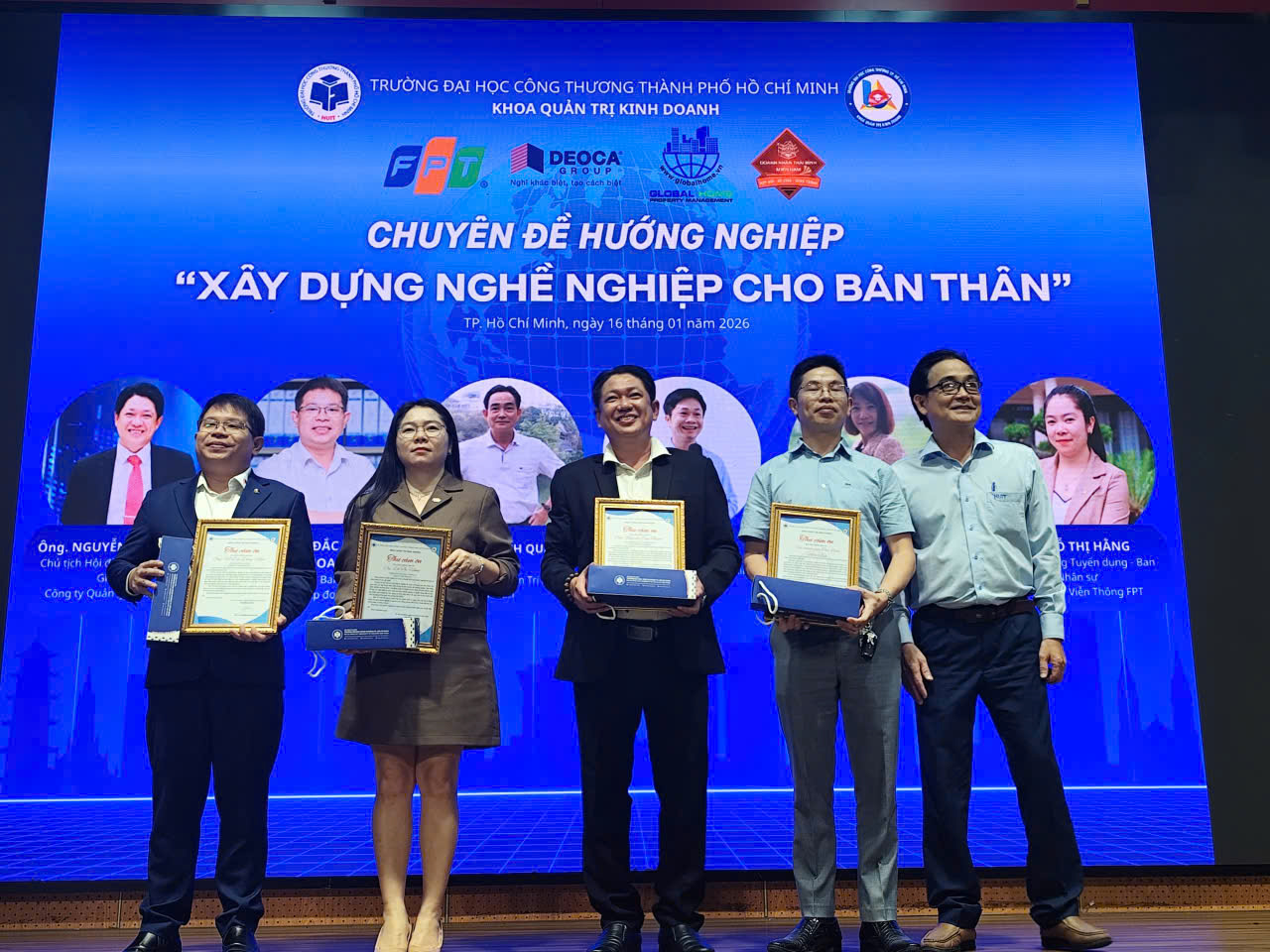 Tối ngày 16/01/2026, tại hội trường Khoa Quản trị Kinh doanh – Trường Đại học Công Thương TP.HCM đã diễn ra chuyên đề hướng nghiệp “Xây dựng nghề nghiệp cho bản thân”. Chương trình quy tụ gần 500 sinh viên, gần 30 doanh nhân – diễn giả cùng các thầy cô, tạo nên một không gian giao lưu ấm cúng, sôi nổi và giàu cảm xúc.